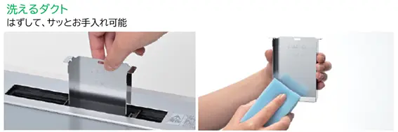 また、汚れやすい排気口には「洗えるダクト」を採用しており、取り外し手洗いで簡単に清潔に保つことができます。