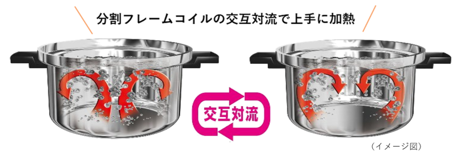 従来のIHでは、鍋を加熱するための磁力が内側に漏れてしまい、鍋の端まで加熱するのが難しいという課題がありました。しかし、「CROSS+TOPシリーズ」では、磁力の分布を上手にコントロールすることで、鍋の端までしっかりと加熱できる三菱IH独自※1の「分割フレームコイル」※2を新たに搭載しました。コイルの形状を進化させることで、鍋やフライパンの端まで均一に加熱できるようになり、調理をさらにサポートします。