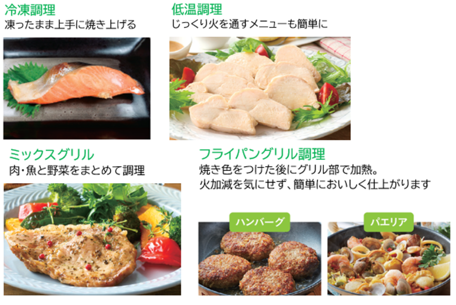「おいしクリーングリル」には、もう一品おかずが欲しいときに嬉しい「冷凍調理」や「低温調理」など、多彩な調理メニューが搭載されており、献立に迷ったときにもとても便利です。グリル皿には耐熱性に優れたセラミックコートが施されているため、冷凍の切身や鶏肉も解凍の手間なく焼き上げることができます。さらに、肉や魚と野菜を一緒に調理できる「ミックスグリル」や、サラダチキンなどにじっくり火を通す「低温調理」も搭載されており、忙しい毎日でも栄養バランスのとれた食事を楽しむためのサポートをしっかりと行います。