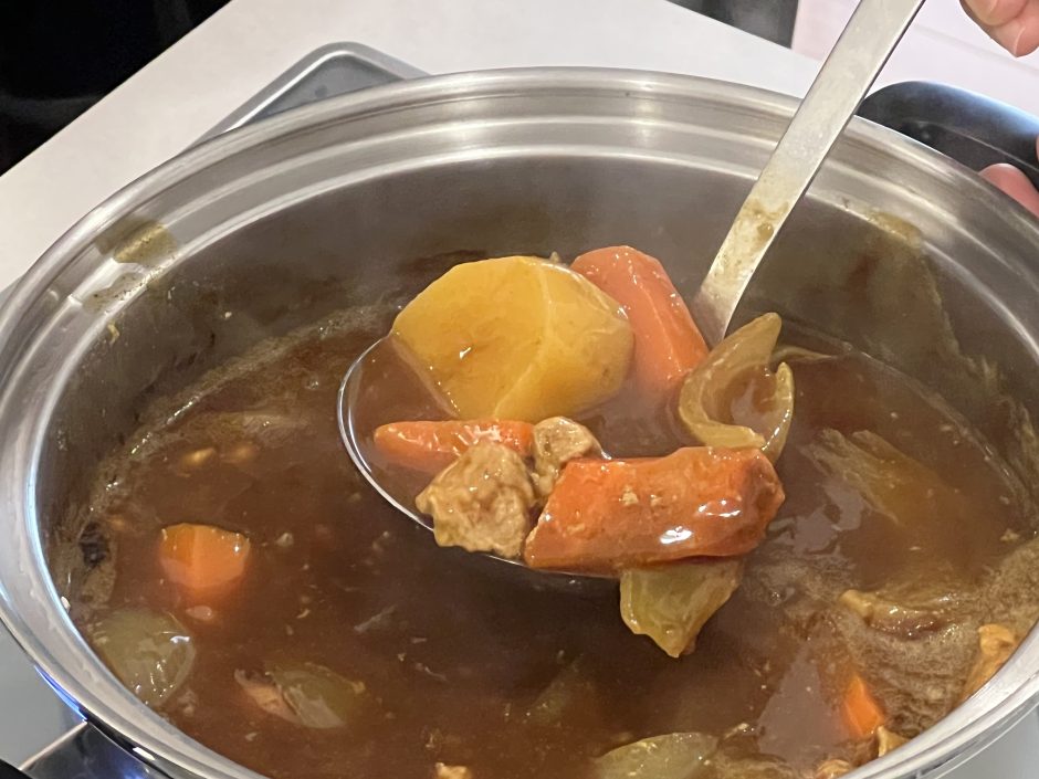 カレーは、ひと煮立ちした食材の上にカレールーを置いておくだけで、外向きと内向きの交互の対流によってかき混ぜながら加熱されます。よく溶けた様子のカレーを持ち上げると、かたちが崩れていないきれいなじゃがいもが現れました。おたまでかき混ぜる手間もないため、十分に火が通りながらも、煮崩れを抑えられた野菜が完成するのはとても魅力的です。