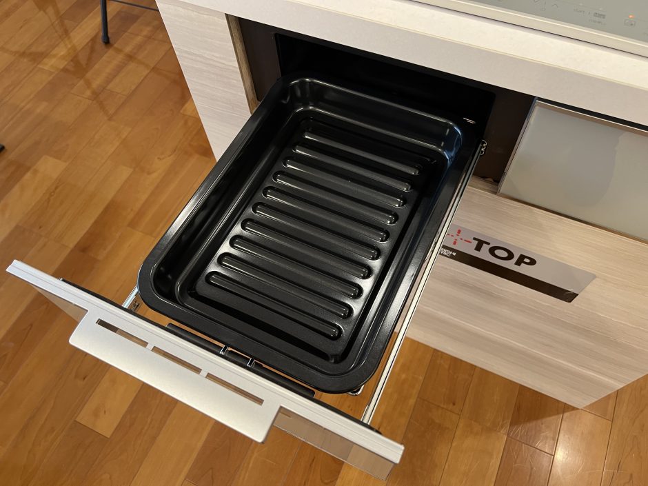 「おいしクリーングリル」は、耐熱性が高いセラミックコートのグリル皿を採用し、冷凍食材も解凍なしでそのまま調理できます。また、トッププレートはもちろん、グリル庫内にもフラット構造を採用しているため掃除がしやすく、排気口には「洗えるダクト」を搭載。気になる油汚れも外して洗うことができます。