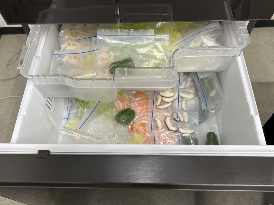 実演用冷蔵庫の冷凍室には、写真のように「できちゃうV冷凍+」体験用の野菜がたくさん収納されていました。上段も下段もこれだけ収納でき、全スペースがV冷凍対応なので、つい食材を買い込んでしまっても安心ですね!