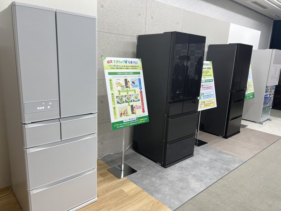 ご紹介トップバッターは、三菱冷蔵庫のフラグシップモデルの最新商品! 会場には、2026年1月23日に発売される野菜室が真ん中の「MZシリーズ」と、2月6日に発売される冷凍室が真ん中の「WZシリーズ」が並んでいました。キッチンに馴染むスタイリッシュなデザインで、佇まいはまさにキッチンの主人公。ひときわ目を惹かれていました。