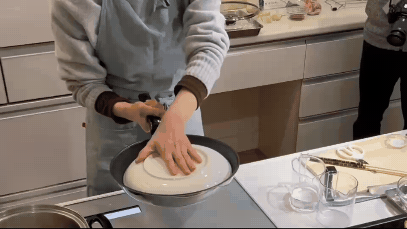解凍の手間がかからないため、「できちゃうV冷凍+」で砕いたキャベツの袋へ他の食材を合わせて入れ、揉み込むことで手を汚さずに餃子のタネが作れます。「凍ったまま混ぜることができるので、ひき肉からドリップが出にくく、ベチャ付き感のないタネができるんです!」と、西岡さんもオススメしていました。こうして冷蔵庫の新機能を活用して手軽に準備できた餃子は、そのままIHクッキングヒーターへとバトンタッチ!